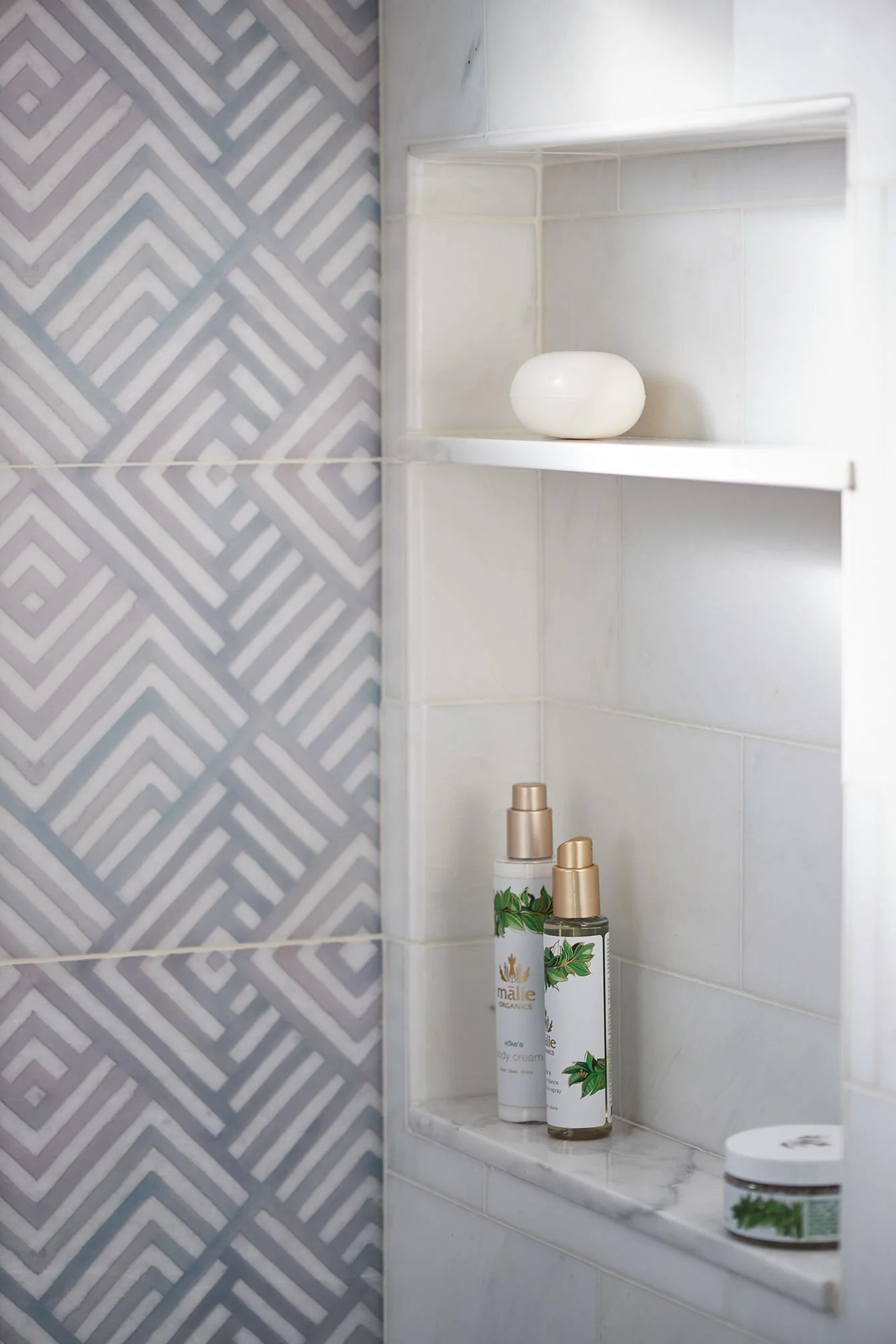 Details of a large shampoo niche, a fun accent tile with geometric white & blue pattern compliments the clean white walls and light mosaic flooring. Our favorite thing in the shower to finish it off are corner floating shelves to allow for optimal function and storage.