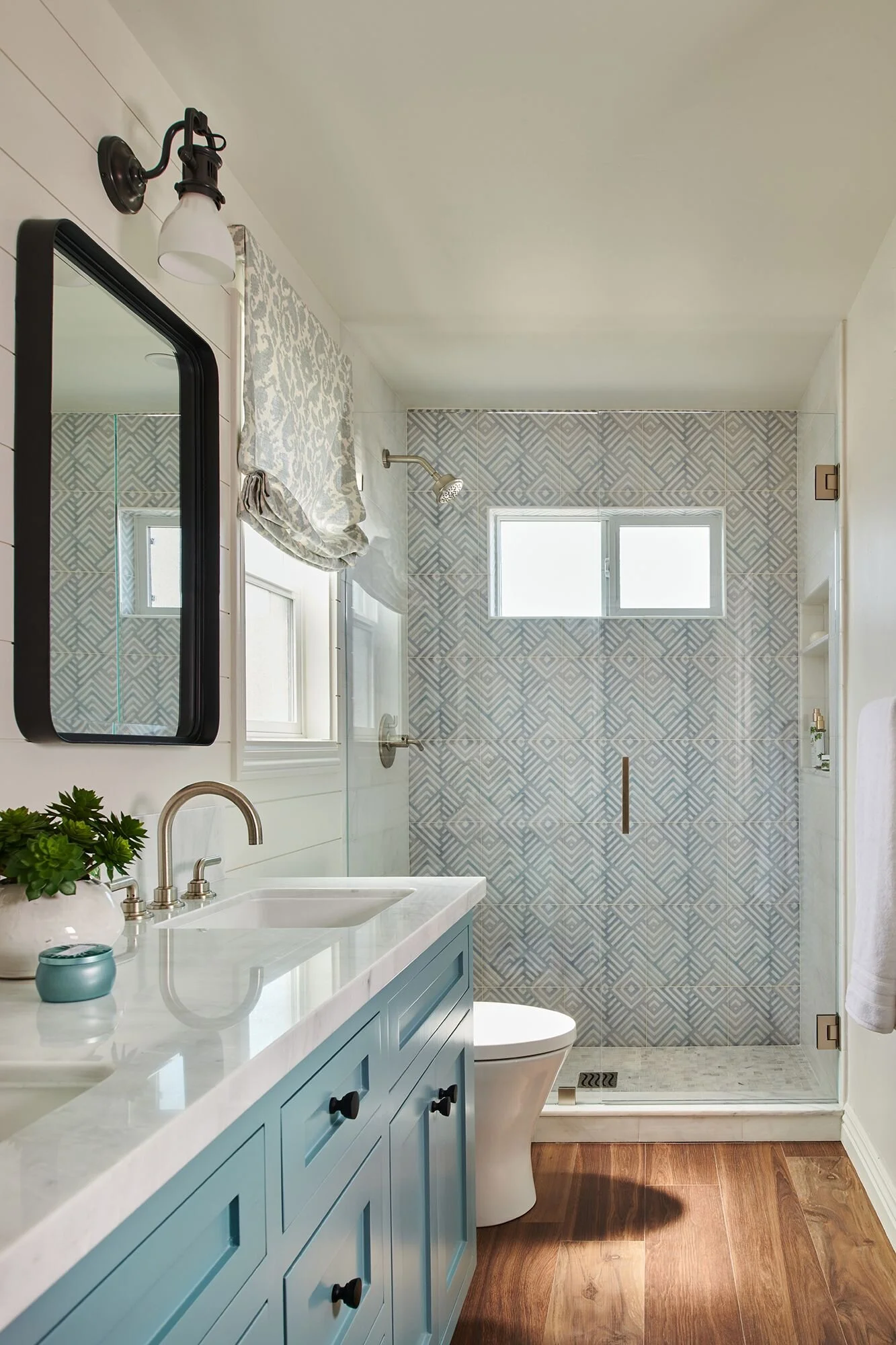 Playful and fun with a splash of color and pattern is a great way to add personality to a bathroom. For this beautiful home just off PCH in Huntington Beach, we brought in the baby blues! We love to mix metals; a brushed stainless steel finish on the fixtures contrasted with matte black hardware and mirrors add a modern element to the space. Classic roman shades in a damask fabric tie in the hint of traditional that we always love to incorporate.