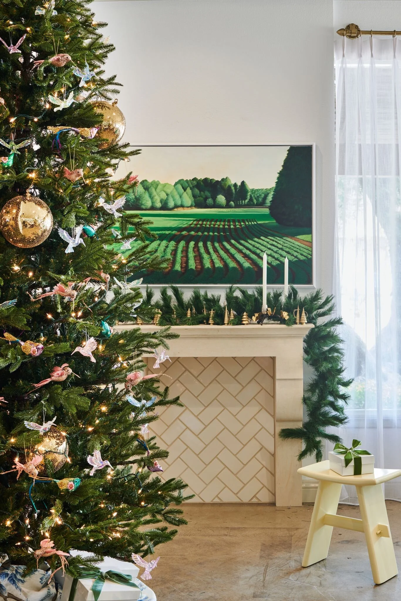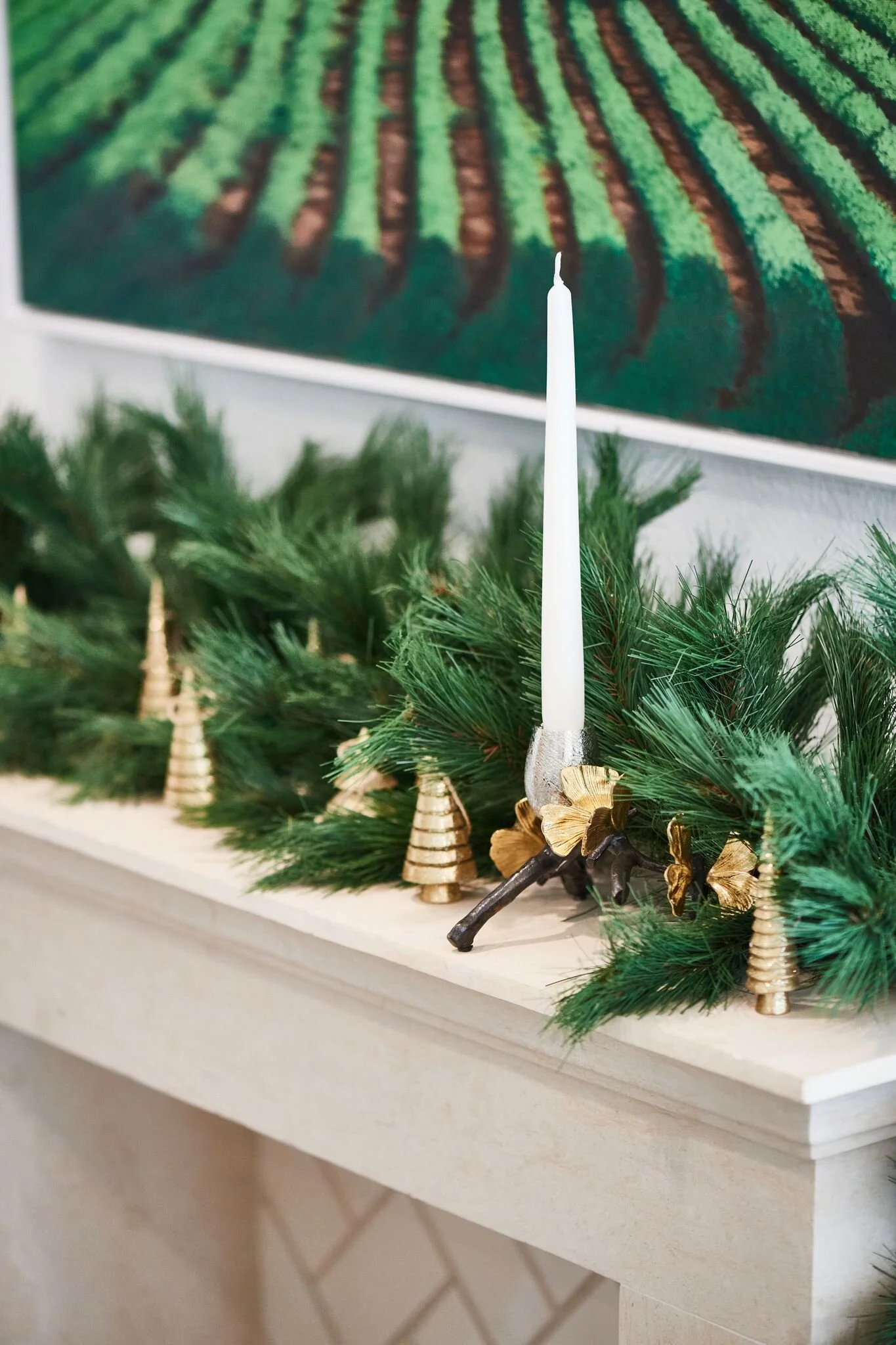 Drape the mantle with a lush garland and sprinkle in these Gold Glitter Tree Ornaments for a touch of holiday glam.