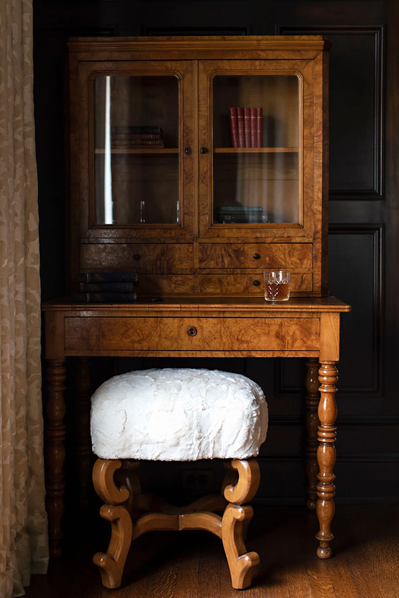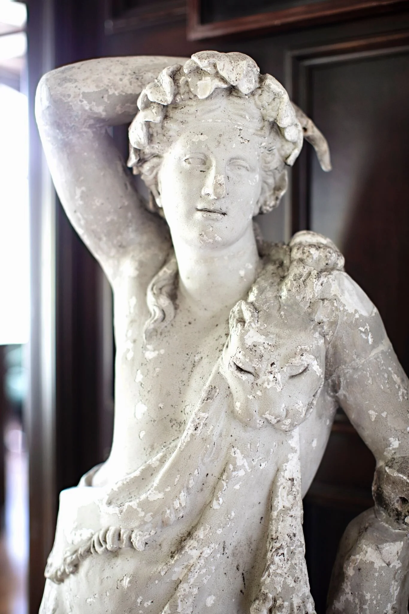 The contrast from light against the dark millwork details the symbolic depictions of ivy in his hair and grapes adorning the tree truck that figuratively holds him up; a true departure from classical sculpture. Probably, my greatest attraction to this relic specific for this special room.
